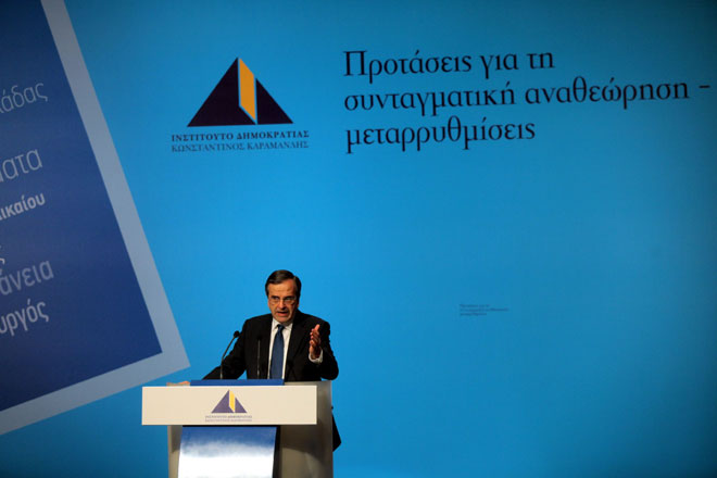 Μίλησε για το «επόμενο ιστορικό άλμα» που καλείται να κάνει η Νέα Δημορκατία, κάνοντας αναφορά στον ιδρυτή του κόμματος τον Κ. Καραμανλή, την αποκατάσταση της Δημοκρατίας το 1974 και την ένταξη της χώρας στην ΕΕ. Η μεταρρύθμιση δεν μπορεί συνεχώς να αναβάλλεται, είπε και τόνισε χαρακτηριστικά ότι «εμείς τολμάμε και θέτουμε την ατζέντα για την μεταρρύθμιση του Συντάγματος». «Δηλώνουμε ανοικτοί στο διάλογο με όλους», κόμματα, φορείς, την κοινωνία, πρόσθεσε ο κ. Σαμαράς.