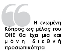 Επεσήμανε δε, τη δημιουργία ενός ενιαίου ομόσπονδου κράτους που θα αποτελείται από δύο συνιστώσες πολιτείες και όχι από δύο διαφορετικά κράτη. «Η ενωμένη Κύπρος ως μέλος του ΟΗΕ θα έχει μια και μόνη διεθνή προσωπικότητα» είπε χαρακτηριστικά.