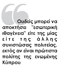 «Επιπλέον, είναι πασιφανές πως η αναφορά σε “εσωτερική ιθαγένεια” γίνεται για να προστατευθεί το δικαίωμα πολιτικής ισότητας των δύο συνιστωσών πολιτειών, λόγω του ότι η συμφωνία για λύση προβλέπει πως η μετεξέλιξη του σημερινού κράτους θα οδηγήσει σε μια δικοινοτική, διζωνική ομοσπονδία με πολιτική ισότητα των δύο συνιστωσών πολιτειών» πρόσθεσε.