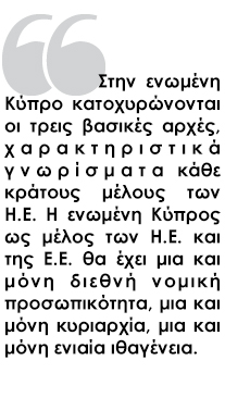 »Τέταρτον, το εξίσου σημαντικό, για να μην πω το σημαντικότερο, είναι ότι στην ενωμένη Κύπρο κατοχυρώνονται οι τρεις βασικές αρχές, χαρακτηριστικά γνωρίσματα κάθε κράτους μέλους των Η.Ε. Η ενωμένη Κύπρος ως μέλος των Η.Ε. και της Ε.Ε. θα έχει μια και μόνη διεθνή νομική προσωπικότητα, μια και μόνη κυριαρχία, μια και μόνη ενιαία ιθαγένεια. Παραπέμπω στην παράγραφο 3» συνέχισε ο Κύπριος πρόεδρος.