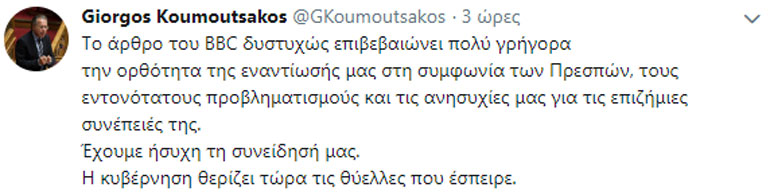«Το άρθρο του BBC δυστυχώς επιβεβαιώνει πολύ γρήγορα την ορθότητα της εναντίωσής μας στη συμφωνία των Πρεσπών, τους εντονότατους προβληματισμούς και τις ανησυχίες μας για τις επιζήμιες συνέπειές της. Έχουμε ήσυχη τη συνείδησή μας. Η κυβέρνηση θερίζει τώρα τις θύελλες που έσπειρε» αναφέρει ο κ. Κουμουτσάκος.