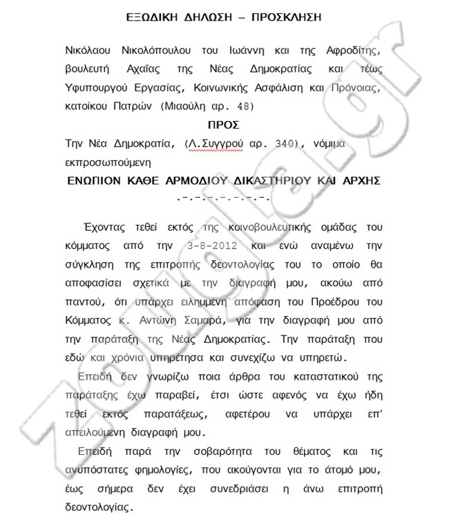 Μέσω του εξωδίκου ο κ. Νικολόπουλος ζητά να ενημερωθεί αν έχει διαγραφεί από το κόμμα καθώς και ποια άρθρα του καταστατικού έχει παραβεί.