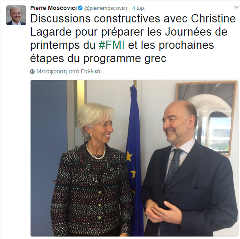 Σε ανάρτησή του στον προσωπικό του λογαριασμό στο Twitter υπογράμμισε πως κατά τη διάρκεια της συνάντησής τους έγινε προετοιμασία της Εαρινής Συνόδου του ΔΝΤ και συζητήθηκαν επόμενα βήματα για το ελληνικό πρόγραμμα.