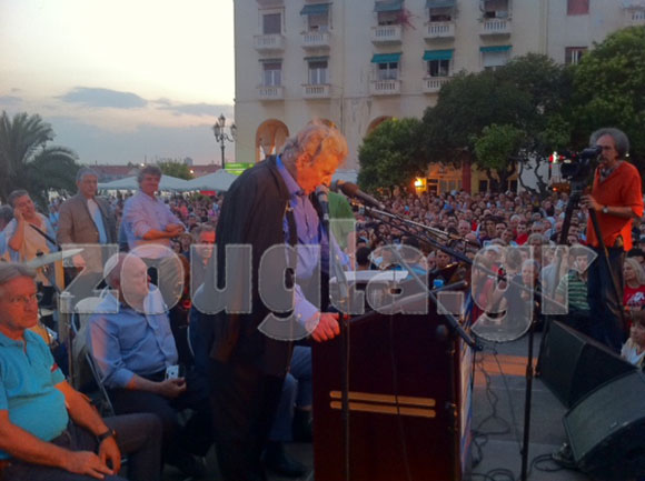 Νωρίτερα ανέβηκαν στο βήμα ο Κώστας Ζουράρις, ο καθηγητής συνταγματικού Δικαίου Γιώργος Κασιμάτης και ο καθηγητής Ευρωπαϊκών Θεσμών, Νότης Μαριάς. Μετά το πέρας των ομιλιών, (τις οποίες παρακολουθήσατε ζωντανά μέσω του zougla radio) και φυσικά του Μίκη Θεοδωράκη, ο οποίος προσπέρασε πολλές σελίδες της ομιλίας του, στη συνέχεια ανέλαβε σκυτάλη ο καλλιτέχνης Μανώλης Μητσιάς, δίνοντας έναν μουσικό τόνο στο κλείσιμο της βραδιάς.
