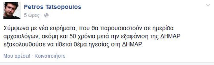 «Σύμφωνα με νέα ευρήματα, που θα παρουσιαστούν σε ημερίδα αρχαιολόγων, ακόμη και 50 χρόνια μετά την εξαφάνιση της ΔΗΜΑΡ εξακολουθούσε να τίθεται θέμα ηγεσίας στη ΔΗΜΑΡ» έγραψε o κ. Τατσόπουλος στην προσωπική του σελίδα στο Facebook.