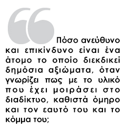 Πόσο ανεύθυνο και επικίνδυνο είναι ένα άτομο το οποίο διεκδικεί δημόσια αξιώματα, λησμονώντας προηγούμενες αχαρακτήριστες συμπεριφορές, όταν γνωρίζει πως με το υλικό που έχει μοιράσει με θράσος στο διαδίκτυο, καθιστά όμηρο και τον εαυτό του και το κόμμα του;