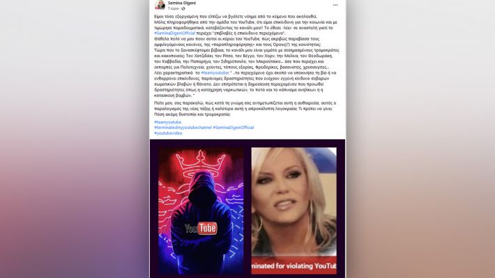 «Ακόμη πιο προκλητικό και από το ίδιο το γεγονός είναι η αιτιολογία που το συνοδεύει, ότι δήθεν το κανάλι «έχει σκοπό να υποκινήσει τη βία ή να ενθαρρύνει επικίνδυνες, παράνομες δραστηριότητες που ενέχουν εγγενή κίνδυνο σοβαρών σωματικών βλαβών ή θάνατο». Είναι το γνωστό πλέον «μήνυμα» της πλατφόρμας που συνοδεύει ανάλογες απαγορεύσεις σε βίντεο με μη «αρεστό» περιεχόμενο, που – απ’ ό,τι φαίνεται από το κανάλι της Σεμίνας Διγενή – φτάνει στο σημείο να ασκεί λογοκρισία ακόμη και για σπουδαίες προσωπικότητες της Τέχνης και του Πολιτισμού.