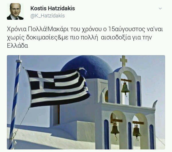 Μέσω του προσωπικού λογαριασμού στο Twitter, έγραψε χαρακτηριστικά: «Χρόνια Πολλά! Μακάρι του χρόνου ο 15αύγουστος να’ ναι χωρίς δοκιμασίες και με πιο πολλή αισιοδοξία για την Ελλάδα».