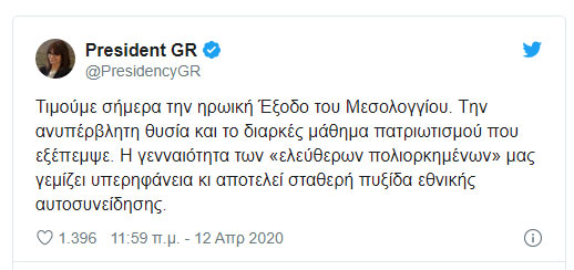 Mε ανάρτησή της στo Facebook και στο twitter η Πρόεδρος της Δημοκρατίας, Κατερίνα Σακελλαροπούλου, αναφέρεται στην επέτειο της ηρωικής Εξόδου του Μεσολογγίου, τονίζοντας την ανυπέρβλητη θυσία και το διαρκές μάθημα πατριωτισμού που αυτή εξέπεμψε.