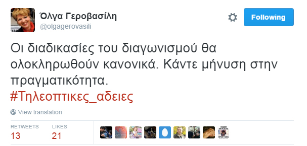 Το ακόλουθο μήνυμα στον προσωπικό της λογαριασμό στο Twitter έγραψε η Όλγα Γεροβασίλη, ξεκαθαρίζοντας ότι «οι διαδικασίες του διαγωνισμού θα ολοκληρωθούν κανονικά».