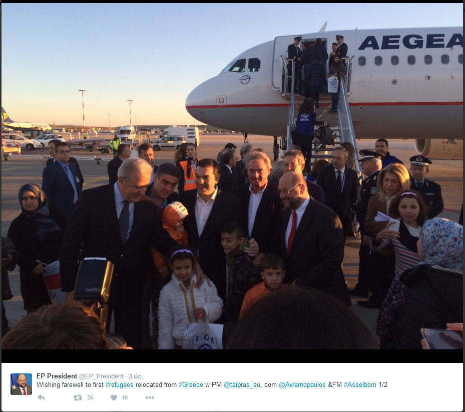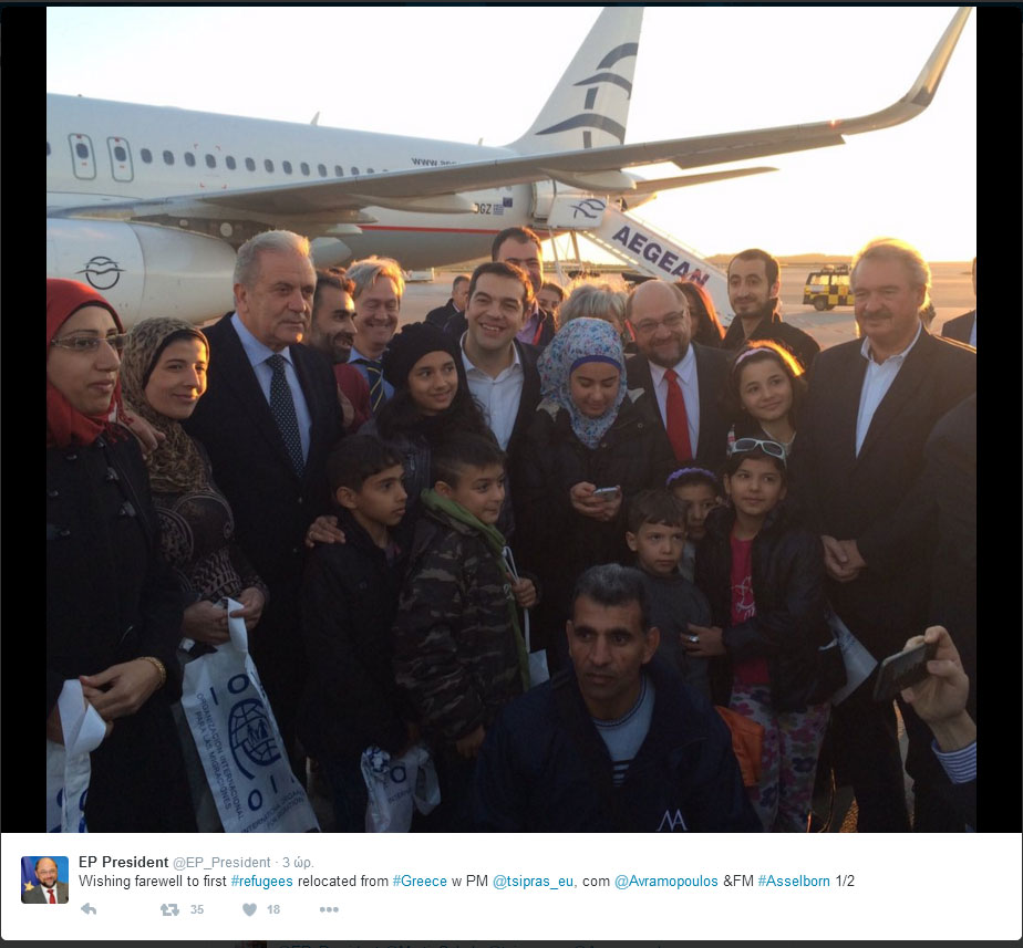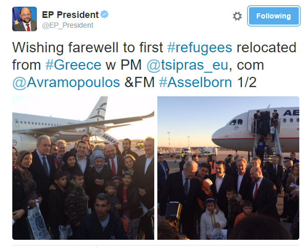 Με δύο φωτογραφίες από την διαδικασία αναχώρησης των τριάντα προσφύγων που θα μετεγκατασταθούν στο Λουξεμβούργο από την Ελλάδα, που δημοσίευσε στο Twitter ο πρόεδρος του Ευρωπαϊκού Κοινοβουλίου Μάρτιν Σουλτς, ευχήθηκε να είναι το πρώτο βήμα και ένα ισχυρό σύμβολο αλληλεγγύης της Ευρώπης.