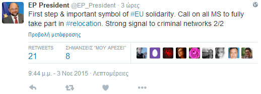 «Πρώτο βήμα και σημαντικό σύμβολο της Ευρωπαϊκής αλληλεγγύης. Κάλεσμα σε όλα τα μέλη-κράτη να συμμετέχουν στην μετεγκατάσταση. Ισχυρό μήνυμα προς εγκληματικά κυκλώματα».