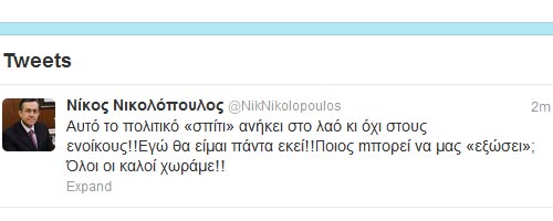 Με ένα νέο tweet επανέρχεται ο Νίκος Νικολόπουλος, μετά την αιχμηρή συνέντευξή του στη zougla.gr όπου μεταξύ άλλων δήλωσε ότι βιάστηκαν να τον διαγράψουν από τη ΝΔ επειδή το Μαξίμου ενοχλήθηκε από τις δηλώσεις του.