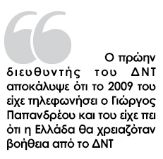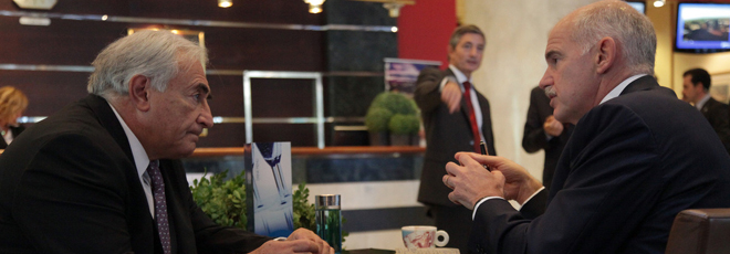 Ο Ντομινίκ Στρος-Καν, που είχε αναλάβει την ηγεσία του ΔΝΤ δυο χρόνια πριν, θυμάται ότι ο Παπανδρέου του τηλεφώνησε και του είπε πως η Ελλάδα θα χρειαζόταν ένα σχέδιο βοήθειας από το ΔΝΤ. Ο Στρος-Καν του ζήτησε τότε να επικοινωνήσει πρώτα με του ευρωπαίους ομολόγους του «ώστε να είσαι σίγουρος ότι συμφωνούν να ασχοληθεί το ΔΝΤ με την Ελλάδα».