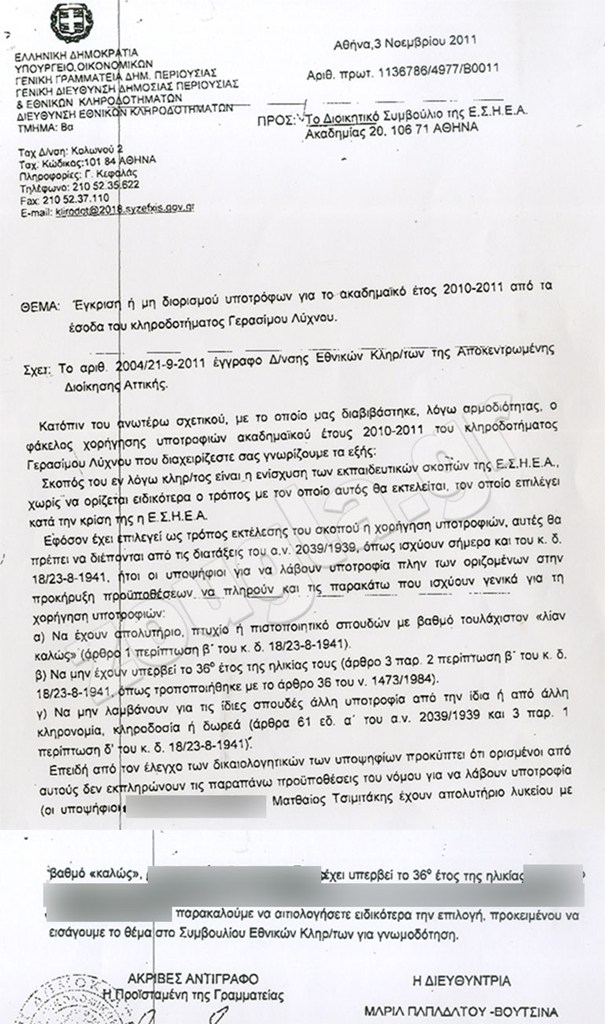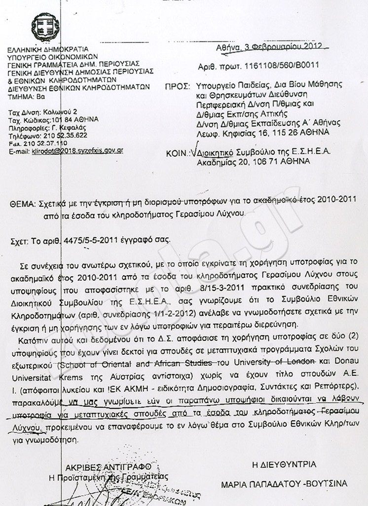 Έτσι στην υπόθεση παρενέβησαν τα δύο αυτά στελέχη του προεδρείου της ΕΣΗΕΑ. Με έγγραφό τους προς το Υπουργείο Οικονομικών (Διεύθυνση Εθνικών Κληροδοτημάτων) ρίχνουν την μπάλα στην εξέδρα για να πάρει την υποτροφία ο συγκεκριμένος υποστηρίζοντας: «…Εν πάση περιπτώσει η συμμετοχή υποψηφίων για τη συγκεκριμένη υποτροφία, αναφέρουν, υπήρξε μικρότερη από τις θέσεις που προκηρύχθηκαν. Δεδομένου ότι το ίδρυμα διαθέτει τα χρήματα για τις 5 υποτροφίες και αφού δεν υπήρξαν άλλοι υποψήφιοι ζητάμε την έγκριση σας για την χορήγηση των υποτροφιών στους παραπάνω..».