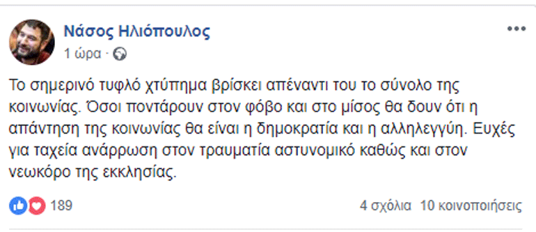 «Όσοι ποντάρουν στον φόβο και στο μίσος θα δουν ότι η απάντηση της κοινωνίας θα είναι η δημοκρατία και η αλληλεγγύη» σημειώνει ο υποψήφιος για τον δήμο Αθηναίων με την «Ανοιχτή Πόλη» και υφυπουργός Εργασίας εκφράζει ευχές για ταχεία ανάρρωση στον τραυματία αστυνομικό καθώς και στον νεωκόρο της εκκλησίας.