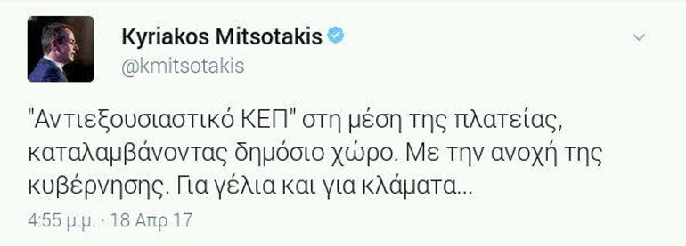 Ιδιαίτερα επικριτικός, κατά της Κυβέρνησης ΣΥΡΙΖΑ-ΑΝΕΛ, ήταν ο Πρόεδρος της Νέας Δημοκρατίας, Κυριάκος Μητσοτάκης, σχολιάζοντας την παρουσία του «αντιεξουαστικού ΚΕΠ» στο κέντρο των Εξαρχείων. Χαρακτηριστικά μέσω του προσωπικού του, λογαριασμού στο Twitter, έγραψε ο κ. Μητσοτάκης: «Αντιεξουσιαστικό ΚΕΠ» στη μέση της πλατείας, καταλαμβάνοντας δημόσιο χώρο. Με την ανοχή της Κυβέρνησης, Για γέλια και για κλάματα…».