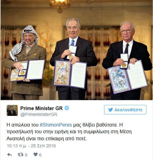 «Η απώλεια του #ShimonPeres μας θλίβει βαθύτατα. Η προσήλωσή του στην ειρήνη και τη συμφιλίωση στη Μέση Ανατολή είναι πιο επίκαιρη...