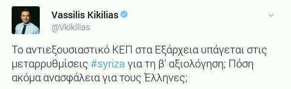 Ο εκπρόσωπος Τύπου της Νέας Δημοκρατίας και βουλευτής Α’ Αθηνών Βασίλης Κικίλιας σχολίασε μέσω του προσωπικού του λογαριασμού στο Twitter τα όσα έχουν συμβεί με το κοντέινερ στην περιοχή των Εξαρχείων που χρησιμοποιείται ως «πολιτικό γραφείο» από άτομα του ευρύτερου αντιεξουσιαστικού χώρου.