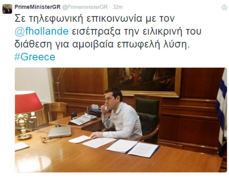 «Σε τηλεφωνική επικοινωνία με τον Φρανσουά Ολάντ, εισέπραξα την ειλικρινή του διάθεση για αμοιβαία επωφελή λύση», ανέφερε μέσω του πρωθυπουργικού λογαριασμού στο Twitter ο Αλέξης Τσίπρας, λίγα λεπτά μετά την επικοινωνία του με τον Γάλλο Πρόεδρο.