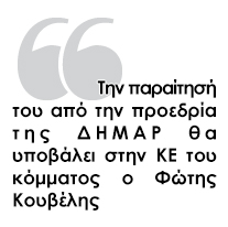 «παραίτηση» Κουβέλη». Εκτιμούν, δε, πως ενδεχομένως να πρόκειται για ελιγμό της ηγεσίας προκειμένου να φανεί ότι υπεβλήθη παραίτηση, αλλά δεν έγινε δεκτή.
