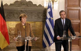 Με ιδιαίτερο ενδιαφέρον αναμενόταν η κοινή συνέντευξη Τύπου της καγκελαρίου της Γερμανίας Άνγκελα Μέρκελ και του πρωθυπουργού της Ελλάδας Αντώνη Σαμαρά στο Μέγαρο Μαξίμου. Οι δύο πολιτικοί ηγέτες αντάλλαξαν φιλοφρονήσεις και παρουσίασαν τις βασικές θεματικές που τέθηκαν επί τάπητος κατά τη διάρκεια της συνάντησής τους.