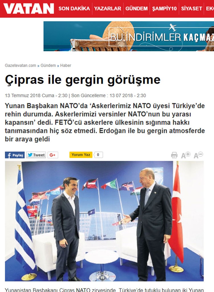 Η συνάντηση Τσίπρα-Ερντογάν αποτελεί θέμα και σε άλλο πρωτοσέλιδο του σημερινού τουρκικού Τύπου: Η εφημερίδα «Milliyet» αναφέρεται στη συνάντηση με τον τίτλο «Παράπονα στον Τσίπρα για τη FETO» (Οργάνωση του Γκιουλέν). Και εστιάζει στο ότι ο πρόεδρος της Τουρκίας μετέφερε στον πρωθυπουργό της Ελλάδας τις ανησυχίες του για την παροχή ασύλου σε μέλη της οργάνωσης.