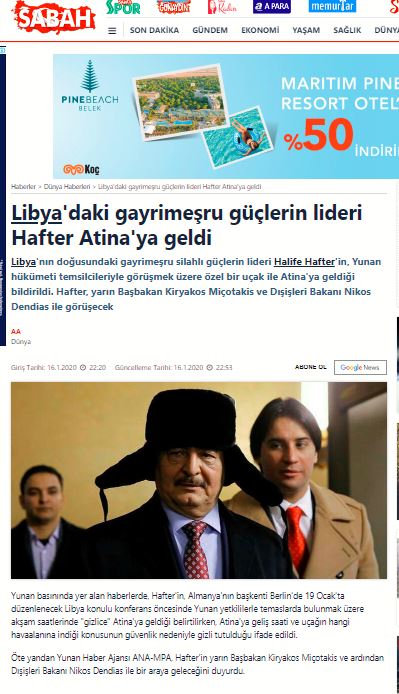 Η εφημερίδα Sabah αναφέρει ότι «ο ηγέτης των παράνομων δυνάμεων στη Λιβύη ήρθε στην Αθήνα. Ταξίδεψε στην Αθήνα με ιδιωτικό αεροσκάφος και στόχος του είναι να συναντηθεί με Έλληνες αξιωματούχους όπως τον υπουργό Εξωτερικών Δένδια και τον πρωθυπουργό Μητσοτάκη».