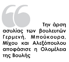 Υπέρ της άρσης ασυλίας των βουλευτών Γιώργου Γερμενή, Νίκου Μίχου, Στάθη Μπούκουρα και Χρυσοβαλάντη Αλεξόπουλου ψήφισε η Ολομέλεια της Βουλής έπειτα από μια θυελλώδη συνεδρίαση, κατά την οποία οι δύο νυν βουλευτές της Χρυσής Αυγής έκαναν λόγο για πολιτική δίωξη, ενώ οι πρώην κράτησαν αποστασιοποιημένη στάση, αναφέροντας ότι δεν συμμετείχαν σε κανένα έγκλημα.
