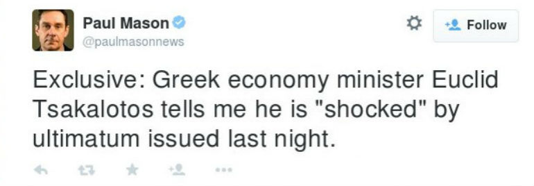 Σοκαρισμένος από το τελεσίγραφο των δανειστών που προσκόμισε στον Αλέξη Τσίπρα ο επικεφαλής της Κομισιόν Ζαν-Κλοντ Γιούνκερ, το βράδυ της Πέμπτης, εμφανίστηκε, ενώπιον του δημοσιογράφου Paul Mason, ο Ευκλείδης Τσακαλώτος.