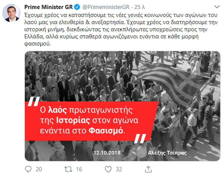 «Έχουμε χρέος να καταστήσουμε τις νέες γενιές κοινωνούς των αγώνων του λαού μας για ελευθερία & ανεξαρτησία. Έχουμε χρέος να διατηρήσουμε την ιστορική μνήμη, διεκδικώντας τις ανεκπλήρωτες υποχρεώσεις προς την Ελλάδα, αλλά κυρίως σταθερά αγωνιζόμενοι ενάντια σε κάθε μορφή φασισμού», αναφέρει, στην ανάρτησή του, ο κ. Τσίπρας και επισυνάπτει φωτογραφία της εποχής με το μήνυμα «ο λαός πρωταγωνιστής της ιστορίας στον αγώνα ενάντια στον φασισμό».