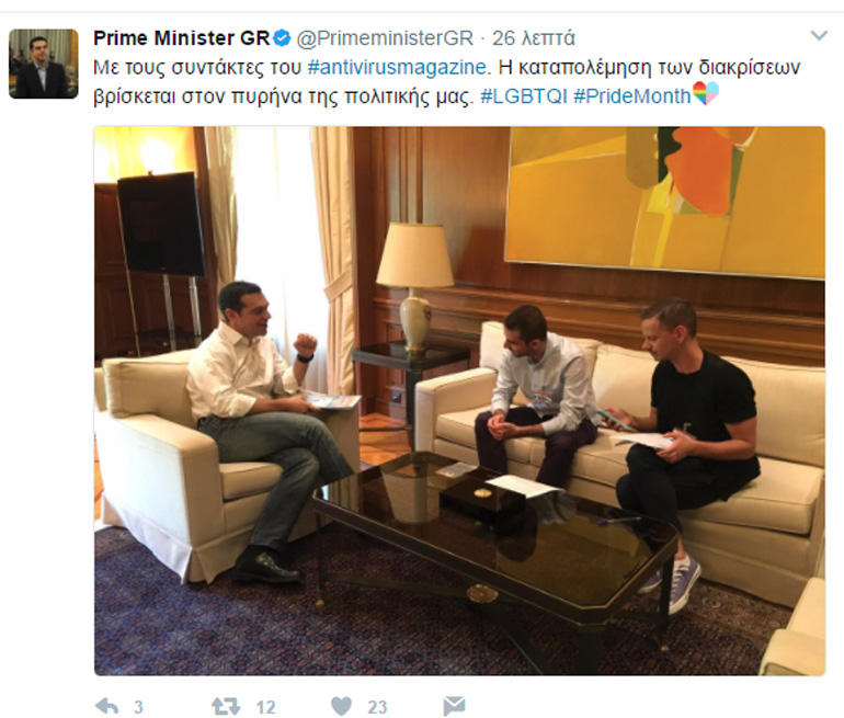 «Με τους συντάκτες του #antivirusmagazine. Η καταπολέμηση των διακρίσεων βρίσκεται στον πυρήνα της πολιτικής μας», έγραψε ο πρωθυπουργός στην ανάρτησή του όπου υπάρχει και φωτογραφία από τη συνάντηση.