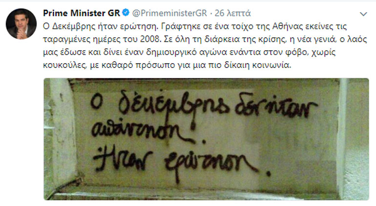 «Ο Δεκέμβρης ήταν ερώτηση. Γράφτηκε σε έναν τοίχο της Αθήνας εκείνες τις ταραγμένες ημέρες του 2008. Σε όλη τη διάρκεια της κρίσης, η νέα γενιά, ο λαός μας έδωσε και δίνει έναν δημιουργικό αγώνα ενάντια στον φόβο, χωρίς κουκούλες, με καθαρό πρόσωπο για μία πιο δίκαιη κοινωνία» αναφέρει σε ανάρτησή του στο twitter ο πρωθυπουργός.