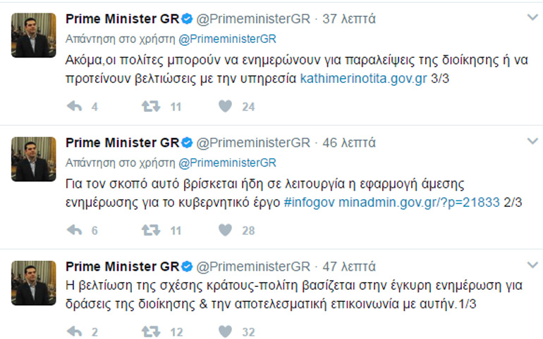 Με αναρτήσεις του στο Twitter ο πρωθυπουργός, Αλέξης Τσίπρας, εστιάζει στην εφαρμογή άμεσης ενημέρωσης για το κυβερνητικό έργο αλλά και στην υπηρεσία μέσω της οποίας οι πολίτες μπορούν να ενημερώνουν για παραλείψεις της διοίκησης και να προτείνουν βελτιώσεις