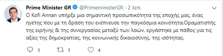 «Ο Kofi Annan υπήρξε μια σημαντική προσωπικότητα της εποχής μας, ένας ηγέτης που με τη δράση του ενέπνευσε την παγκόσμια κοινότητα. Οραματιστής της ειρήνης & της συνεργασίας μεταξύ των λαών, εργάστηκε με πάθος για τις αξίες της δημοκρατίας, της κοινωνικής δικαιοσύνης, της ισότητας» γράφει ο πρωθυπουργός, Αλέξης Τσίπρας, σε ανάρτησή του στο Twitter, με αφορμή την απώλεια του πρώην γενικού γραμματέα του Οργανισμού Ηνωμένων Εθνών.