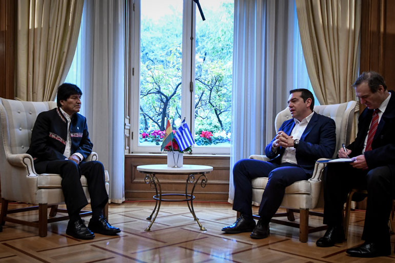 Πρόσκληση στον πρωθυπουργό Αλέξη Τσίπρα να επισκεφθεί τη Βολιβία απηύθυνε ο Έβο Μοράλες, κατά τη διάρκεια του διαλόγου που είχαν οι δυο τους, ενώπιον των τηλεοπτικών συνεργείων, στο Μέγαρο Μαξίμου.