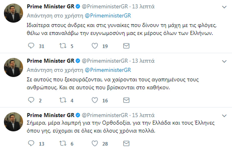«Σήμερα, μέρα λαμπρή για την Ορθοδοξία, για την Ελλάδα και τους Έλληνες όπου γης, εύχομαι σε όλες και όλους χρόνια πολλά. Σε αυτούς που ξεκουράζονται, να χαίρονται τους αγαπημένους τους ανθρώπους. Και σε αυτούς που βρίσκονται στο καθήκον. Ιδιαίτερα στους άνδρες και στις γυναίκες που δίνουν τη μάχη με τις φλόγες, θέλω να επαναλάβω την ευγνωμοσύνη μας εκ μέρους όλων των Ελλήνων» έγραψε ο πρωθυπουργός.