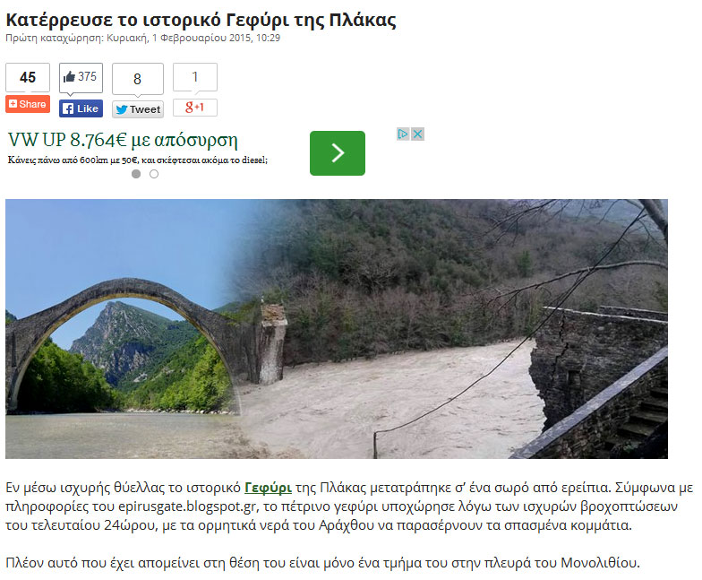Δείτε φωτογραφίες και video από το κατεστραμμένο πέτρινο γεφύρι, πατώντας εδώ….