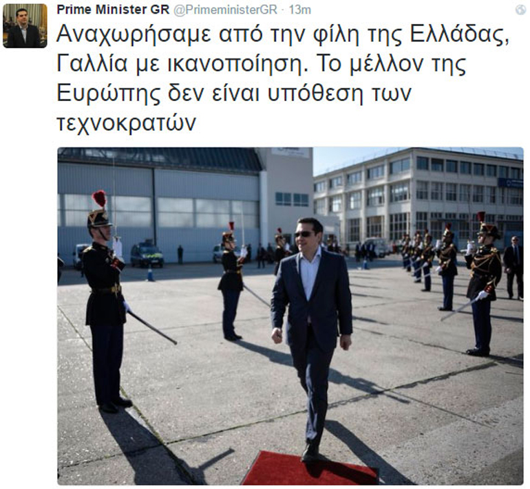 «Αναχωρήσαμε από τη φίλη της Ελλάδας, Γαλλία με ικανοποίηση. Το μέλλον της Ευρώπης δεν είναι υπόθεση των τεχνοκρατών» έγραψε ο πρωθυπουργός Αλέξης Τσίπρας στο Twitter για την επίσκεψή του στο Παρίσι και τη συνάντηση με τον Φρανσουά Ολάντ.