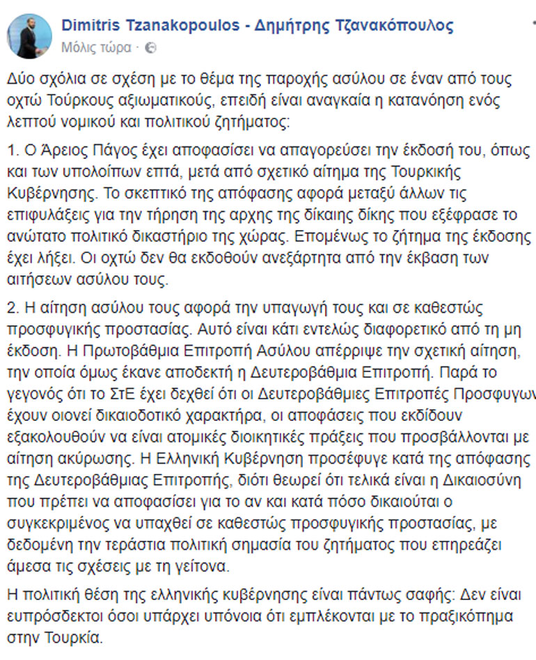 Με ανάρτησή του στον προσωπικό του λογαριασμό στο Facebook ο κυβερνητικός εκπρόσωπος, Δημήτρης Τζανακόπουλος, αναφέρεται στο θέμα παροχής ασύλου για τους οκτώ Τούρκους αξιωματικούς τονίζοντας «δεν είναι ευπρόσδεκτοι όσοι υπάρχει υπόνοια ότι εμπλέκονται με το πραξικόπημα».