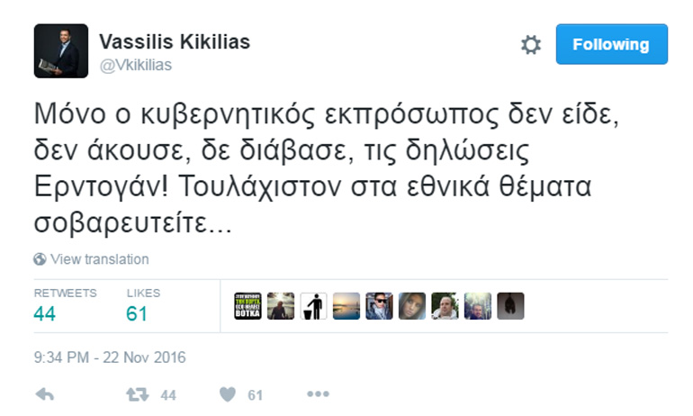 Συγκεκριμένα, ο κ. Κικίλιας έγραψε: «Μόνο ο κυβερνητικός εκπρόσωπος δεν είδε, δεν άκουσε, δε διάβασε, τις δηλώσεις Ερντογάν! Τουλάχιστον στα εθνικά θέματα σοβαρευτείτε..»