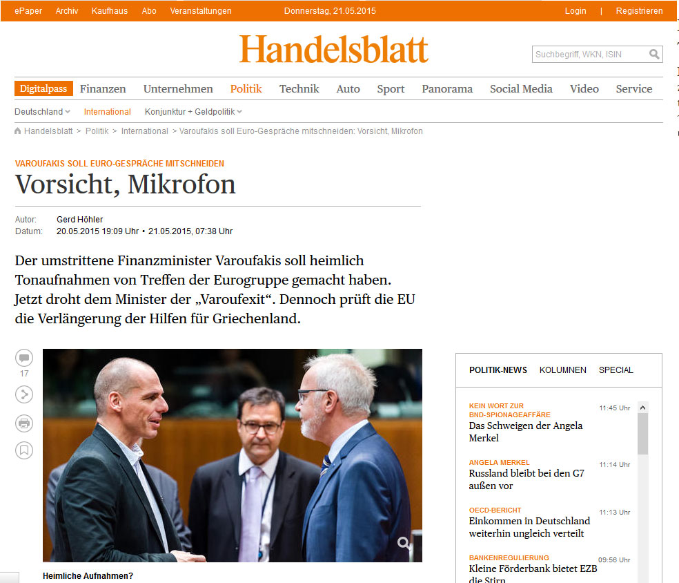 Handelsblatt: «Αν πράγματι, ο Έλληνας υπουργός Οικονομικών κατέγραψε τις συνομιλίες, τότε δύσκολα θα μπορέσει να παραμείνει στη θέση του»