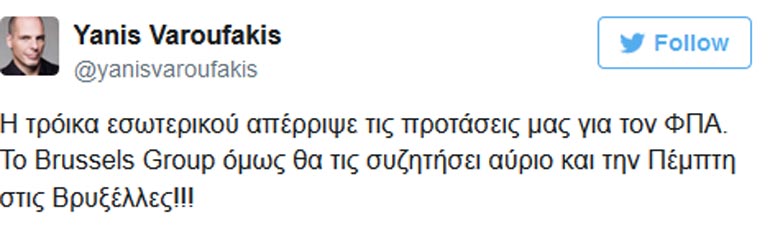 «H τρόικα εσωτερικού απέρριψε τις προτάσεις μας για τον ΦΠΑ. Το Brussels Group όμως θα τις συζητήσει αύριο και την Πέμπτη στις Βρυξέλλες», αναφέρει ο υπουργός στο twitter.