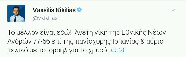 «Το μέλλον είναι εδώ! Άνετη νίκη της Εθνικής Νέων Αντρών 77-56 επί της πανίσχυρης Ισπανίας και αύριο τελικό με το Ισραήλ για το χρυσό» έγραψε ο Εκπρόσωπος Τύπου της Νέας Δημοκρατίας, Βουλευτής Ά Αθηνών, Βασίλης Κικίλιας, στον προσωπικό του λογαριασμό στο Twitter, για το νικηφόρο αποτέλεσμα του Εθνικής μας, στο Ευρωπαϊκό Πρωτάθλημα , FIBA U20 European Championship – Hellas2017», που διεξάγεται στο Ηράκλειο.