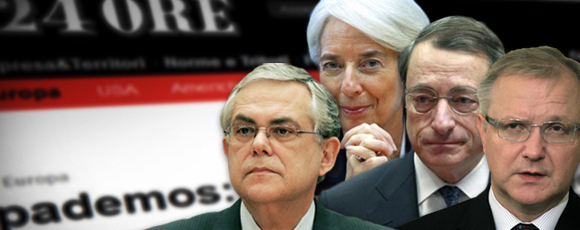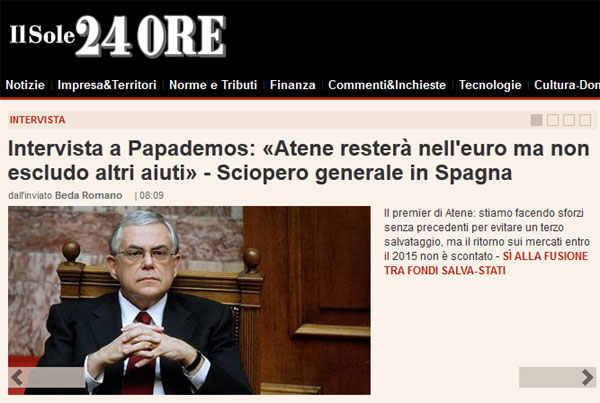 Με τον τίτλο «Η Ελλάδα θα παραμείνει στο ευρώ, αλλά ενδεχομένως να χρειαστεί νέα βοήθεια», ο Λουκάς Παπαδήμος σε συνέντευξή του στην ιταλική εφημερίδα «Il Sole 24 Ore» επιχειρεί να προϊδεάσει τους Ευρωπαίους εταίρους για τις οικονομικές εξελίξεις έως το 2015.