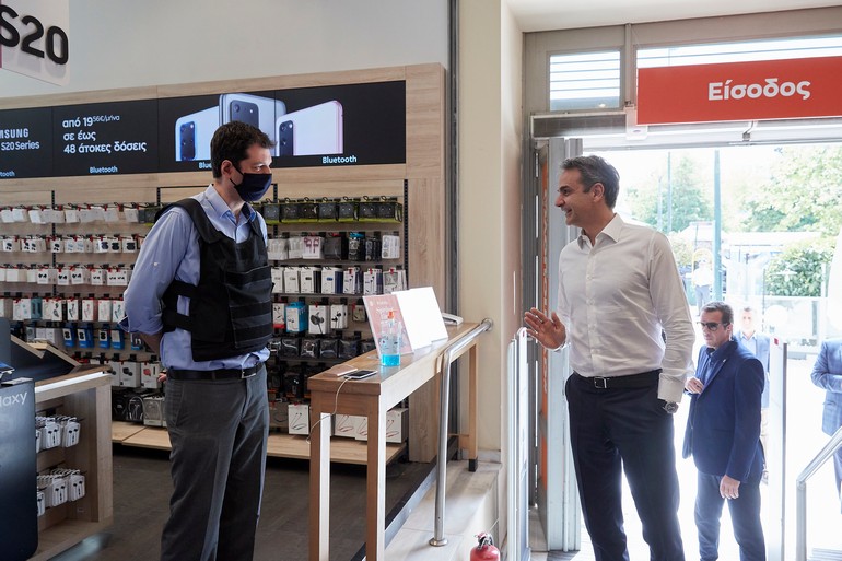 Ο Κυριάκος Μητσοτάκης ενδιαφέρθηκε ιδιαίτερα για την εφαρμογή των μέτρων υγειονομικής προστασίας. Συνομίλησε με φύλακες στην είσοδο πολλών καταστημάτων, ρώτησε για τον μέγιστο αριθμό πελατών ανάλογα με το εμβαδόν κάθε χώρου και σημείωσε την τήρηση των αποστάσεων στα ταμεία.