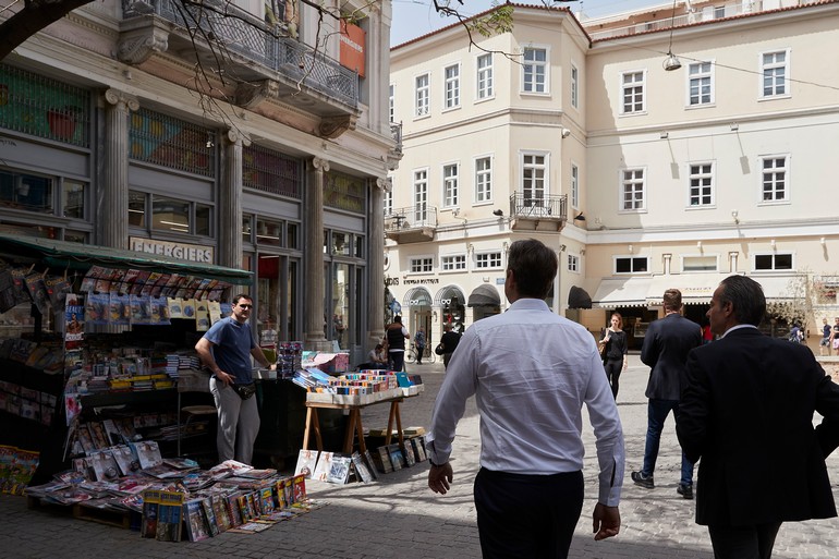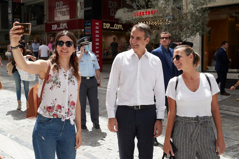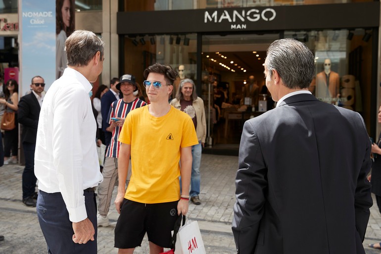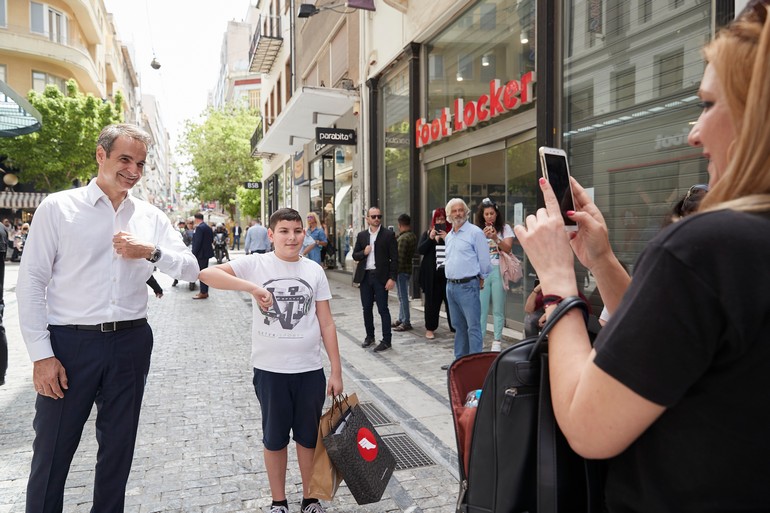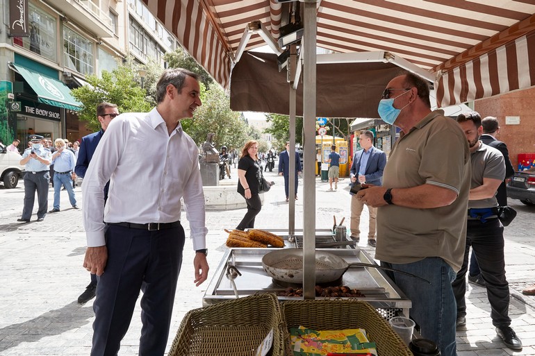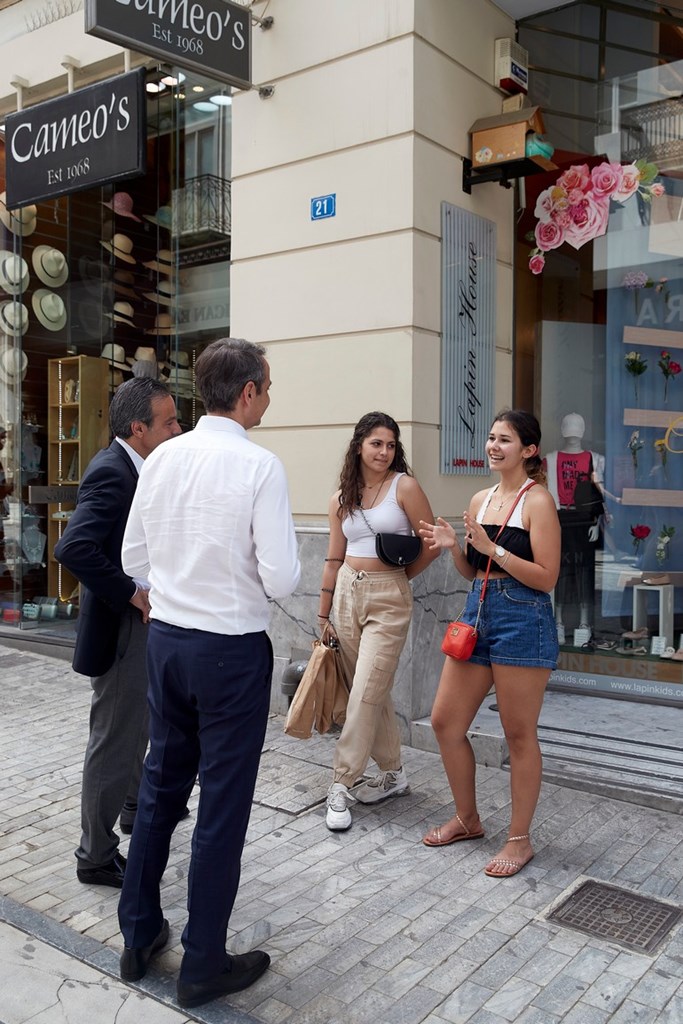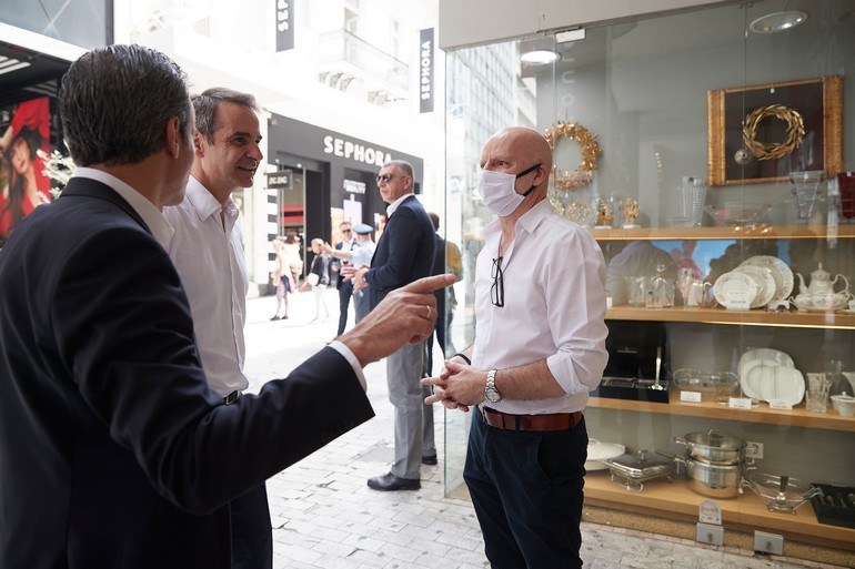 Την οδό Ερμού στο κέντρο της Αθήνας επισκέφθηκε το πρωί της Πέμπτης ο Κυριάκος Μητσοτάκης, προκειμένου να συνομιλήσει με καταστηματάρχες και πολίτες για την πορεία της αγοράς στην εμπορική «καρδιά» της Αθήνας, λίγες ημέρες μετά την επαναλειτουργία του λιανεμπορίου.