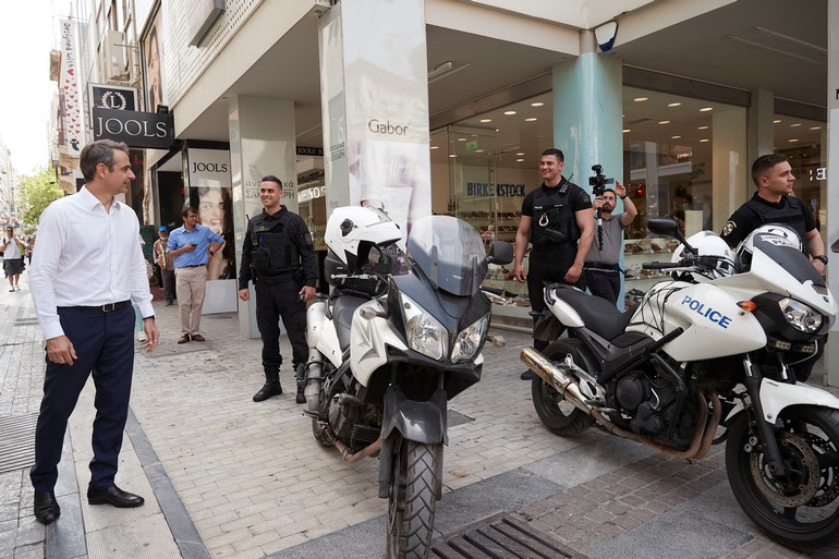 Συνομιλώντας με αστυνομικούς, ο Κυριάκος Μητσοτάκης διαπίστωσε ότι ο εξοπλισμός τους είναι καινούριος, επισήμανε ότι η κυβέρνηση μερίμνησε ειδικά για την απόκτηση αλεξίσφαιρων γιλέκων και συζήτησε μαζί τους για τα επιχειρησιακά καθήκοντά τους.