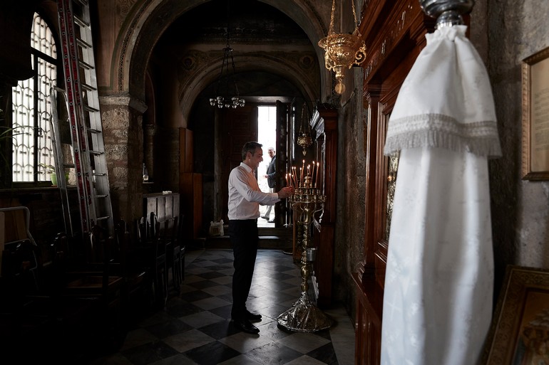 Ο πρωθυπουργός σταμάτησε για λίγα λεπτά στην Εκκλησία της Παναγίας Καπνικαρέας, όπου άναψε ένα κερί, ενώ δεν παρέλειψε να ευχαριστήσει τους άνδρες της Αστυνομίας, οι οποίοι φροντίζουν για την ασφάλεια της περιοχής.