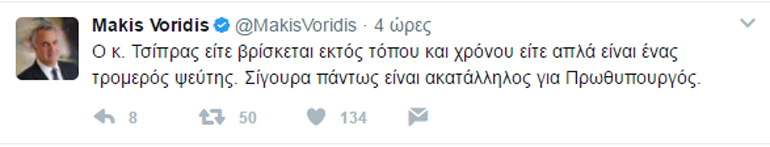Επίθεση κατά του Αλέξη Τσίπρα μέσω του προσωπικού του λογαριασμού στο twitter εξαπέλυσε ο βουλευτής της Νέας Δημοκρατίας, Μάκης Βορίδης χαρακτηρίζοντάς τον «ακατάλληλο» για την πρωθυπουργία.